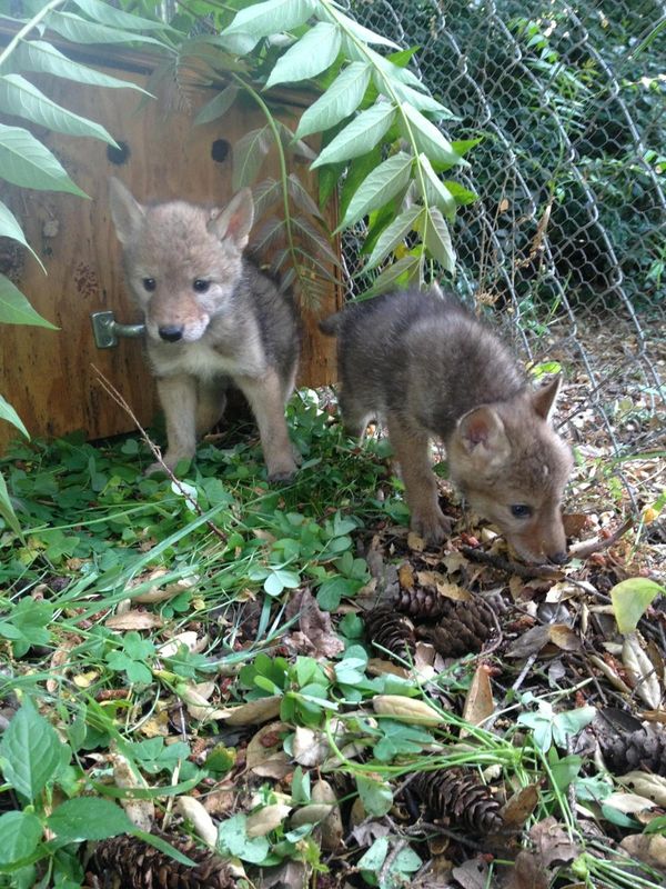 Coyote Pups Explore Enclosure in Wildlife Rehabilitation Community